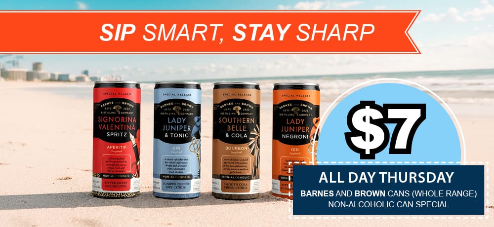 Terms and conditions. Available all day every Thursday in Rogues Sports Bar from Thursday 5 March until Thursday 28 May 2026. Barnes & Brown Cans (Entire Range) just $7 each. A financial Membership Card must be swiped or used at time of placing order to activate offer. Cannot be used in conjunction with any other offer. Rogues Sports Bar practices the responsible service of alcohol.